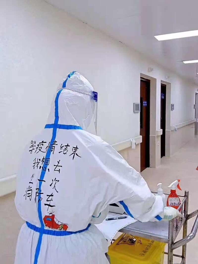 抗疫一线,厚重的防护服让人辨不出容貌。为便于沟通交流,医护人员会在防护服上写下身份信息和简短话语。方寸之“地”像是临时辟出的“心愿墙”。