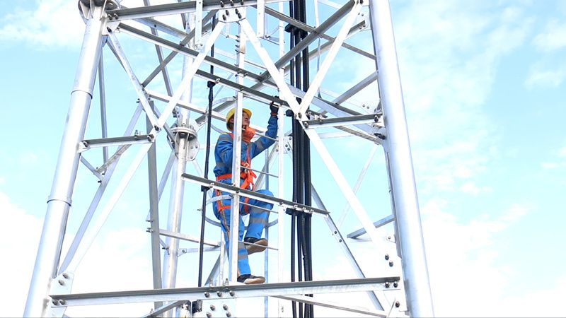 魏鑫宇今天要维护的这座铁塔高45米,要考验的不仅是体力,还包括胆量和毅力。作为工区里的“大哥”,魏鑫宇独自担起了危险性较大的登塔任务。他头戴安全帽,系好安全绳,带着厚厚的防滑手套,“全副武装”攀上了窄窄的直梯。