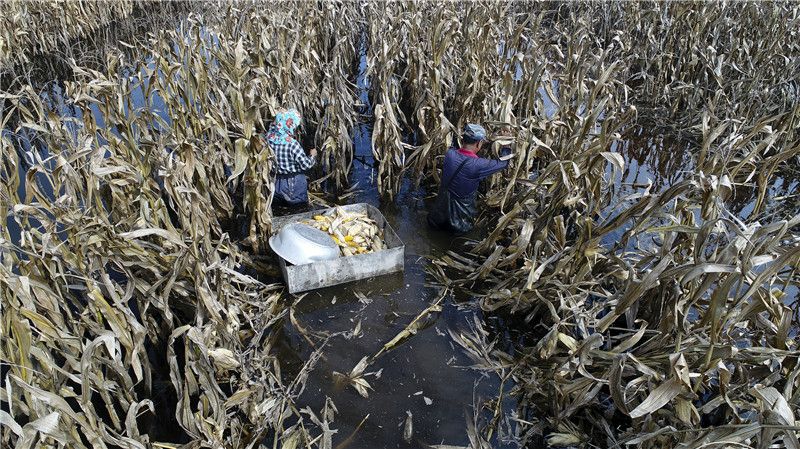 2021年10月7日,山西运城永济,一对农村夫妇用铝箱抢收被淹的玉米。