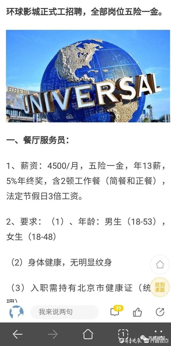 记者查询北京环球影城的一线员工招聘启示发现,除了住宿费,薪酬待遇基本和网传的一致:“税前年薪6.2w,约合月薪4000-5000,六险一金,有补助补贴,有食堂班车,住宿费730(6人间)拎包入住,水电自理”。