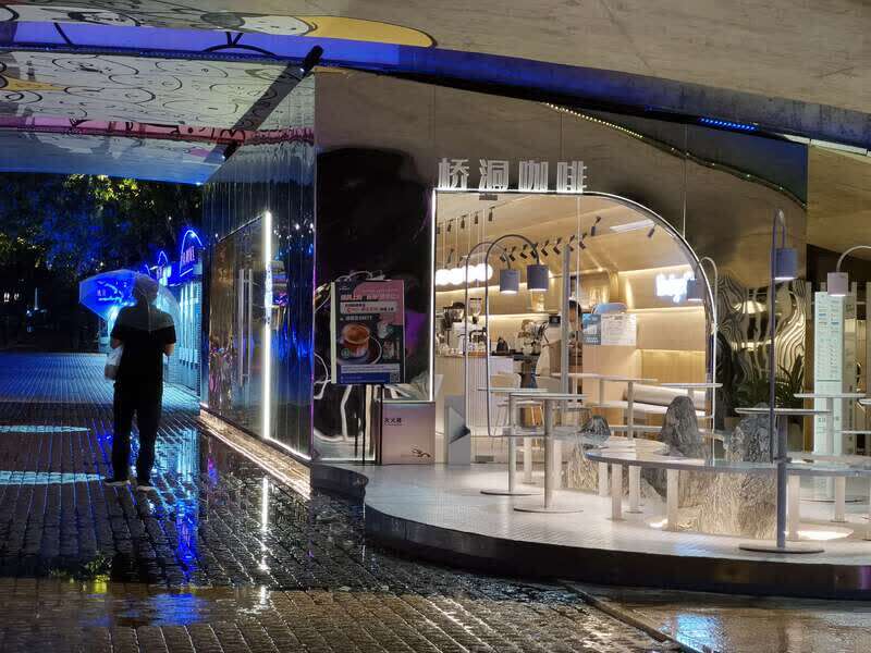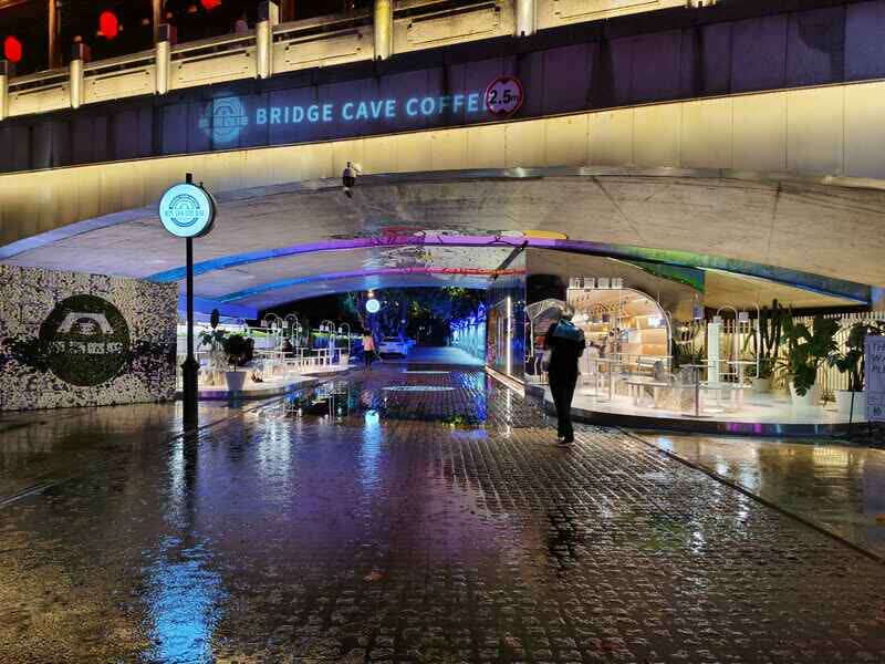 水仙桥下,脏乱差的状况一去不复返,取而代之的是一个现代化的桥洞咖啡馆,与桥洞涂鸦等环境艺术呼应,形成了别具一格的休闲空间。