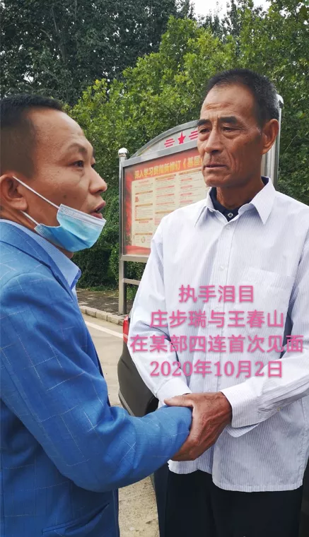 2020年10月2日,王春山和庄元东侄儿庄步瑞在某部四连首次见面,两人执手泪目。