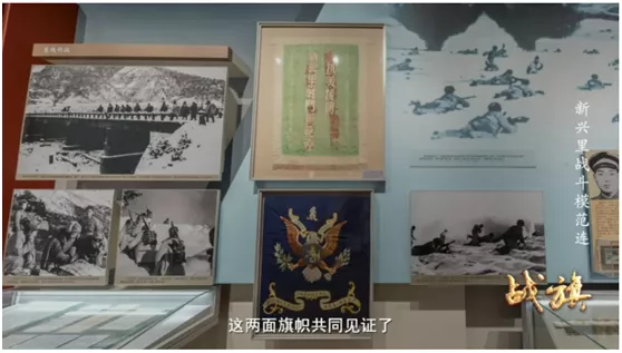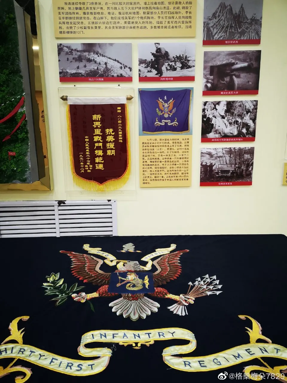 王春山介绍说,这面团旗是整个朝鲜战场上志愿军缴获的唯一一面美军的军旗,也是美国自1776年建国以来至今为止唯一一次军旗被缴。二战时在欧洲战场上没被德国人缴过,在太平洋战场上没被日本人缴过,在越南战场上也没有弄丢过军旗,在伊拉克、阿富汗战场上照样没丢过军旗。这么厉害的美军做梦也没想到,在239团2营4连手里栽了大跟头,团部被我们中国人一锅端了,团长麦克莱恩让人打死了。