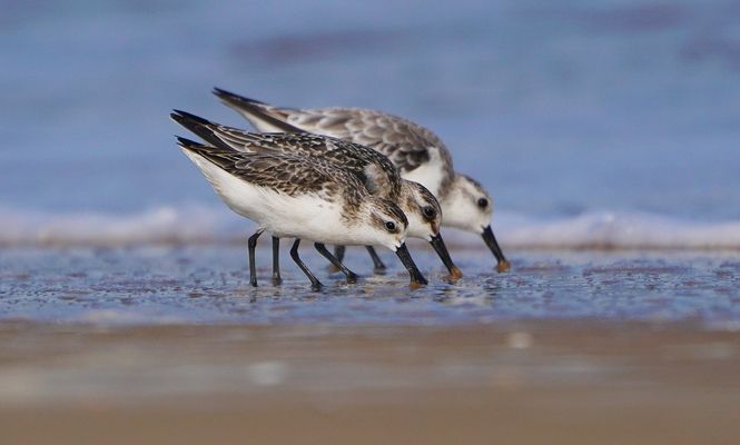 2019年9月29日,广东汕头,一只勺嘴鹬(左一)与两只三趾鹬在一起觅食。图片作者:郑康华/视觉中国
