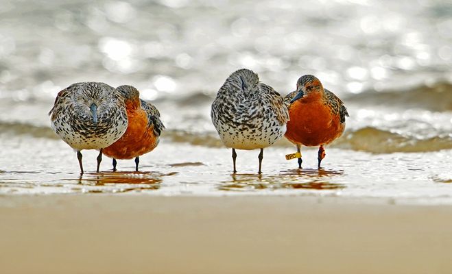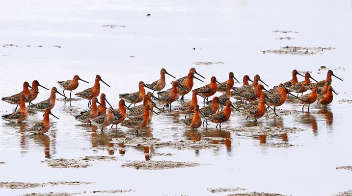 2021年4月19日,广东汕头,经过数千公里的长途迁徙,一只脚戴光敏定位仪和标有YPC编码的红腹滨鹬(澳洲西北部布鲁姆2015年环志)与同伴和全球濒危鸟类、国家二级保护动物大滨鹬,一起出现在韩江口的海滩涂湿地歇息。图片作者:郑康华/视觉中国