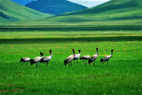 2012年07月01日,四川省阿坝藏族羌族自治州,黑颈鹤在四川阿坝若尔盖大草原。图片作者:张铨生/视觉中国