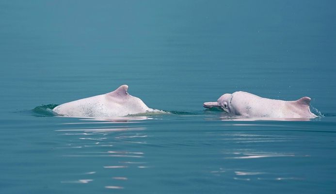 2021年3月28日,广东汕头,两头成年的国家一级保护动物中华白海豚正在韩江口浅海水域结伴觅食。图片作者:郑康华/视觉中国