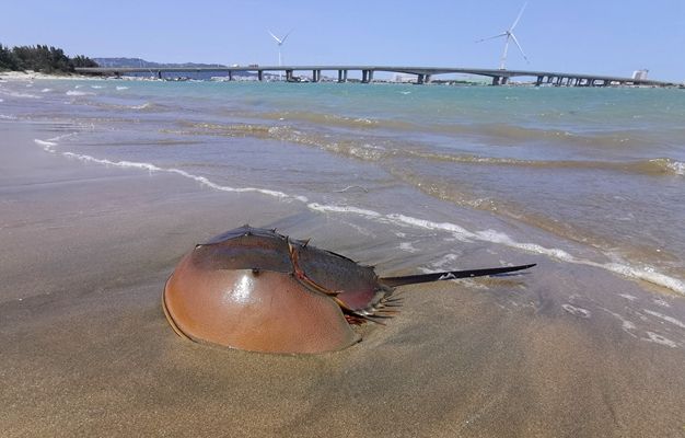 2021年4月10日,汕头濠江口,一只不明死因的全球濒危物种、国家二级保护动物中国鲎出现在沙滩上。据红树林湿地研究专家刘毅博士分析,这只中国鲎为雌性,年龄超过十岁,已接近成年。图片作者:郑康华/视觉中国