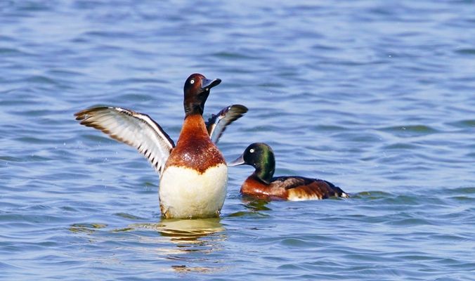 2021年2月5日,广东汕头,青头潜鸭喜欢在水上扇翅膀。图片作者:郑康华/视觉中国