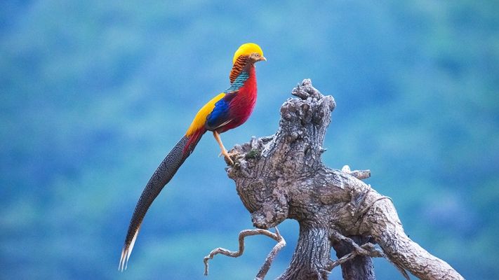红腹锦鸡又名金鸡,中型鸡类,体长59—110厘米。尾特长,约38—42厘米。雄鸟羽色华丽,头具金黄色丝状羽冠,上体除上背浓绿色外,其余为金黄,后颈被有橙棕色而缀有黑边的扇状羽,形成披肩状。下体深红色,尾羽黑褐色,满缀以桂黄色斑点。雌鸟头顶和后颈黑褐色,其余体羽棕黄色,满缀以黑褐色虫蠢状斑和横斑。脚黄色。野外特征极明显,全身羽毛颜色互相衬托,赤橙黄绿青蓝紫具全,光彩夺目,是是驰名中外的观赏鸟类。2018年8月28日,拍摄于河南省三门峡市 灵宝县 寺河乡 草庙村 南窑沟。图片作者:杨宪虹/视觉中国