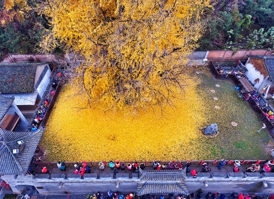 2015年11月21日,西安市,1400年古银杏落叶成金毯,周末吸引游人排队参观。图片作者:签约供稿人/视觉中国
