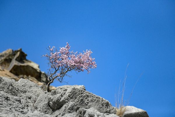 2020年4月1日,宁夏贺兰山国家森林公园内,中国国家二级重点保护野生植物蒙古扁桃盛开,成为山间粉色的风景。图片作者:签约供稿人/视觉中国