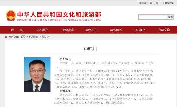 文旅部网站“部领导”栏目信息显示,卢映川已于2021年9月任文化和旅游部党组成员。
