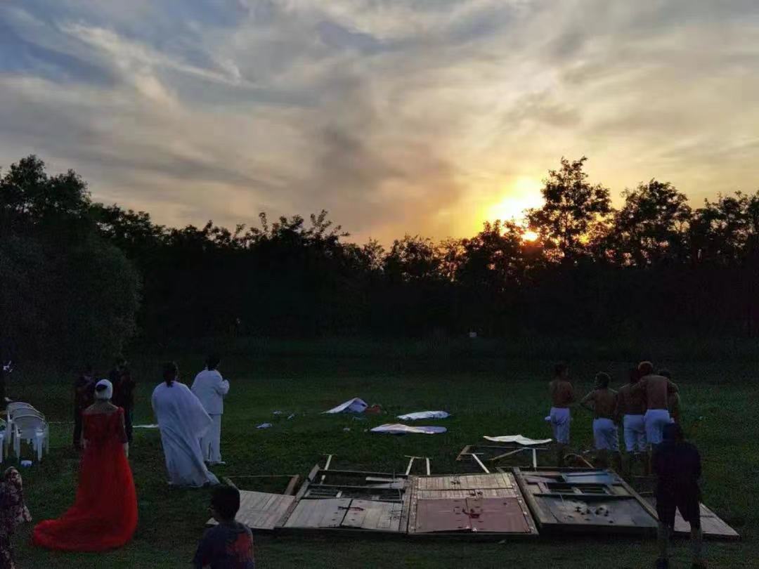 每天都很累。每天都要把重重的道具——几扇大门、一块牌匾、电视机、钢筋……搬到演出场地,把舞台搭起来。下午五六点,别人演出结束,空出场地,他们开始排练,常常排到深夜。排练结束,拆台,把道具一一搬回去。第二天再来一遍。