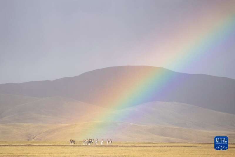 这是9月22日在羌塘国家级自然保护区拍摄的彩虹之下的藏野驴。新华社记者 孙瑞博 摄