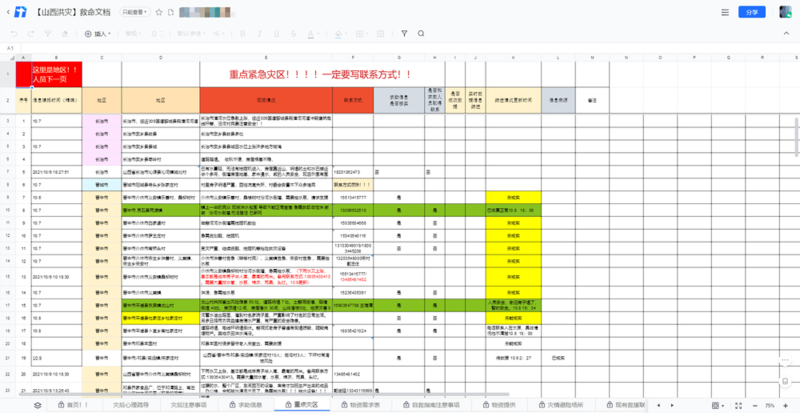 “山西家人们,我们要不要建立一个文档,统计救援和灾情信息,方便救援工作?”20岁的山西女孩祁一菲创建了一份“【山西洪灾】救命文档”,迅速得到了大家的响应。在近日山西洪涝灾害的救援中,这份开放性质的文档最多时有200余人同时在线参与维护。