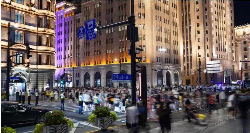 10月1日晚上19时一过,外滩区域客流压境。