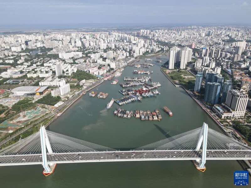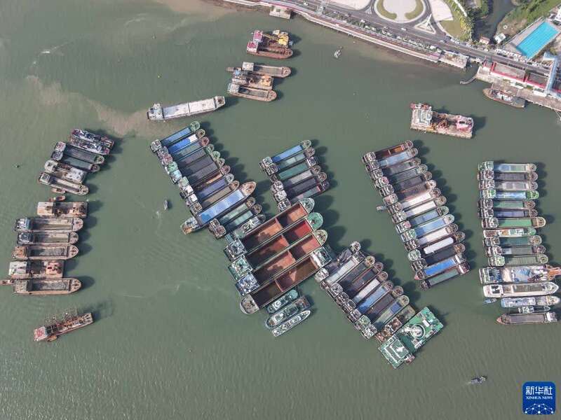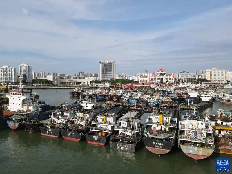 10月12日,船舶在海口市新港码头内停靠避风(无人机照片)。