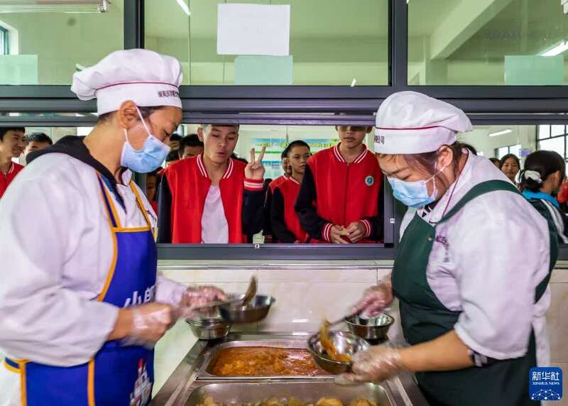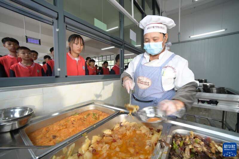 10月12日,工作人员在贵州省遵义市绥阳县风华镇中心学校食堂为排队学生打取营养餐。