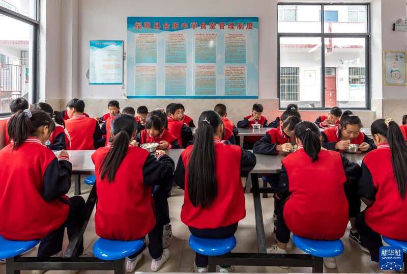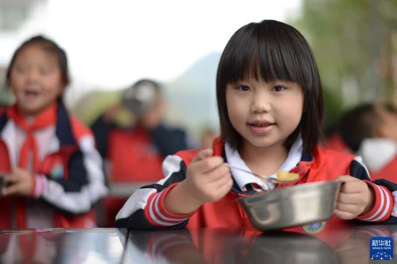 10月12日,在贵州省遵义市绥阳县风华镇中心学校食堂,学生在吃营养餐。
