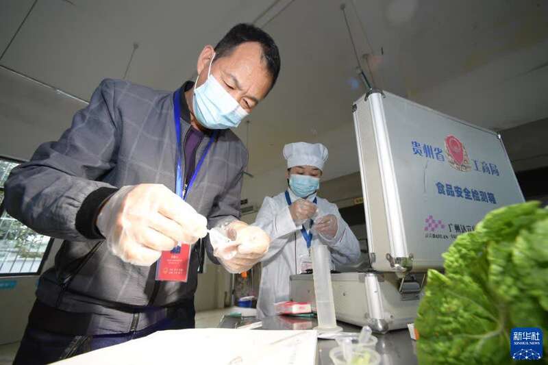 10月12日,在贵州省遵义市绥阳县风华镇中心学校食堂,食品质检员在对食材进行采样检测。