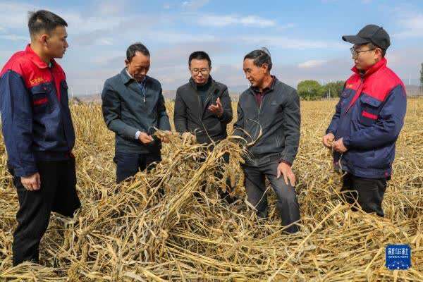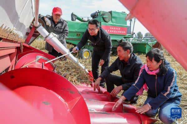 10月13日,山西农业大学教授原向阳(左二)在向合作社工作人员介绍收割机操作注意事项。新华社记者 曹阳 摄