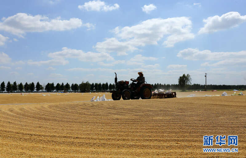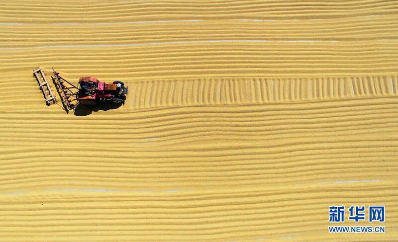 农户驾驶机械在安徽省合肥市庐江县白湖镇现代农业示范基地翻晒机收的稻谷。新华网发(王闽 摄)