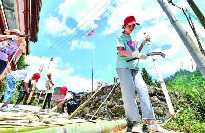 乌英苗寨跨越贵州广西两省区,曾是脱贫攻坚“硬骨头”。2020年,乌英苗寨实现整体脱贫,学生们的暑假生活也更加丰富多彩。图为2021年8月21日,学生们在乌英苗寨做竹篱笆。新华社发