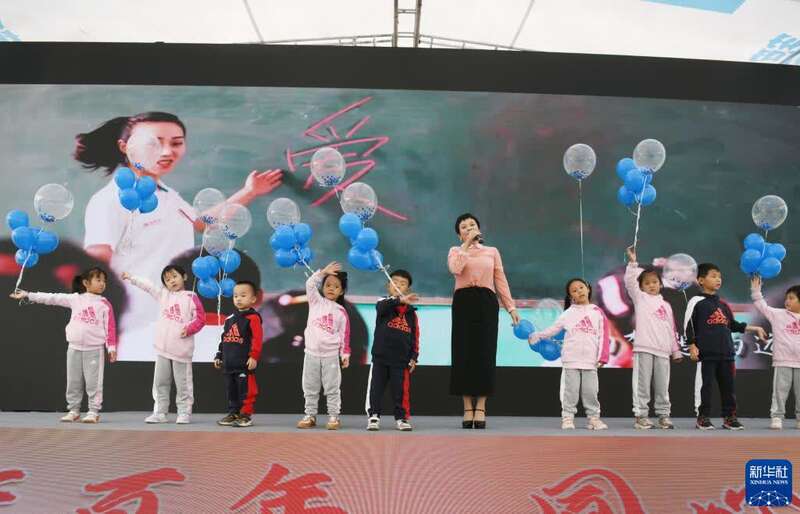 10月14日,来到工地的留守儿童在工作人员带领下唱歌。