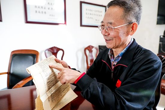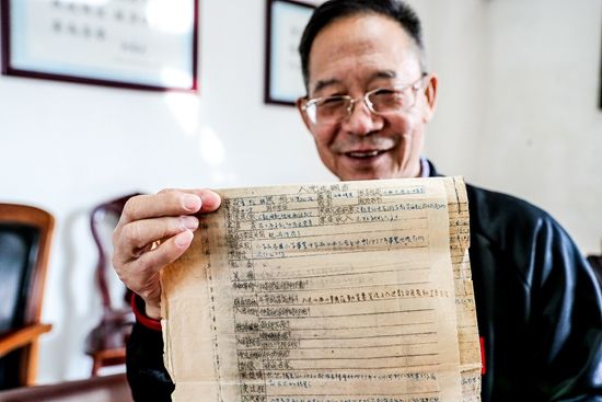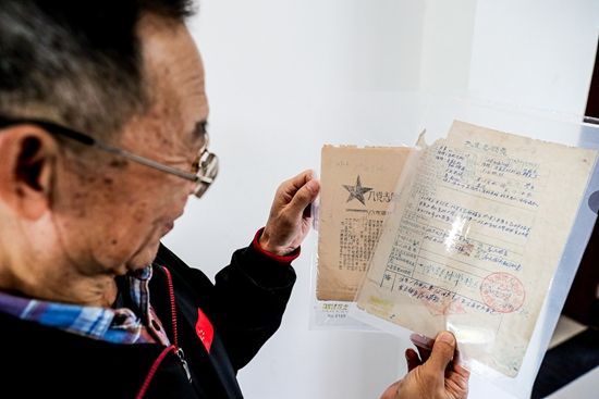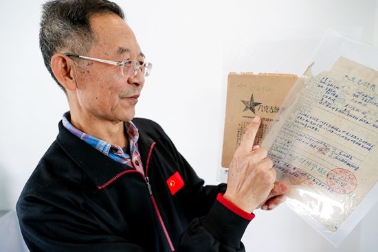 2021年10月13日,北京丰台区莲花池军休所,韩珍明老人展示收藏的入党志愿书。