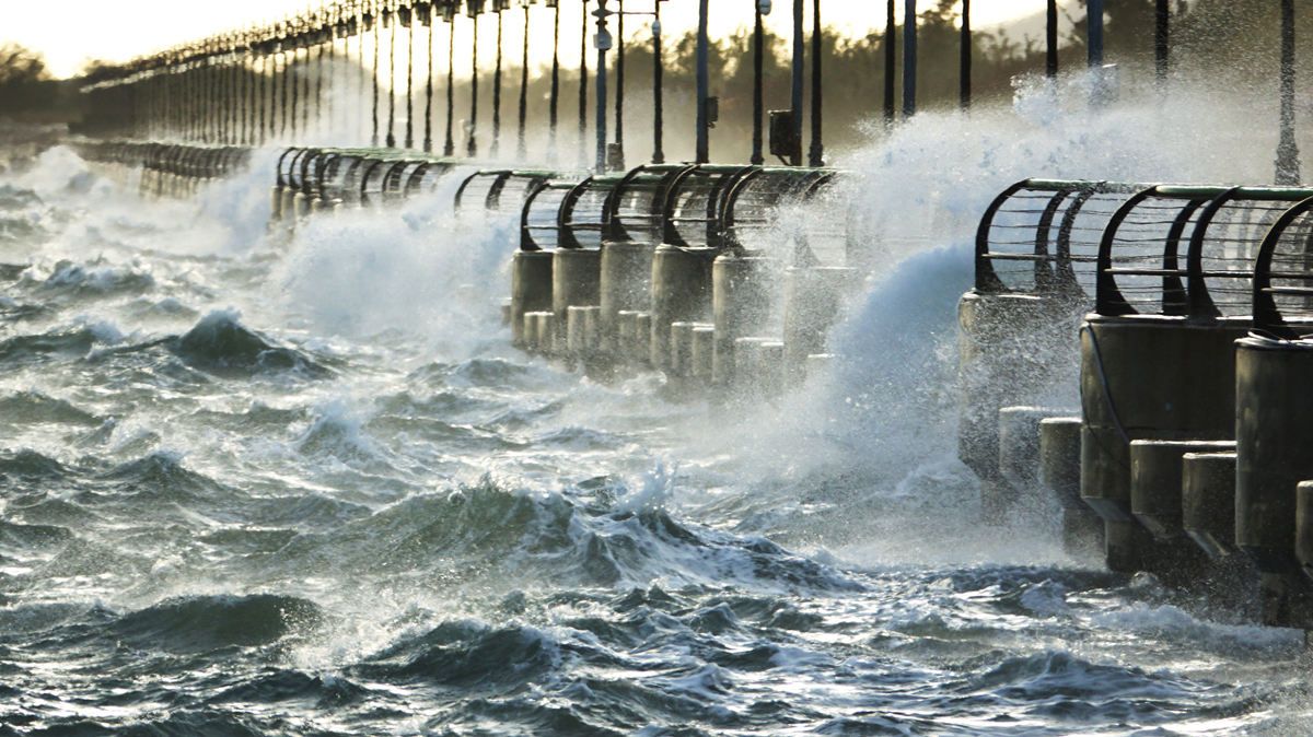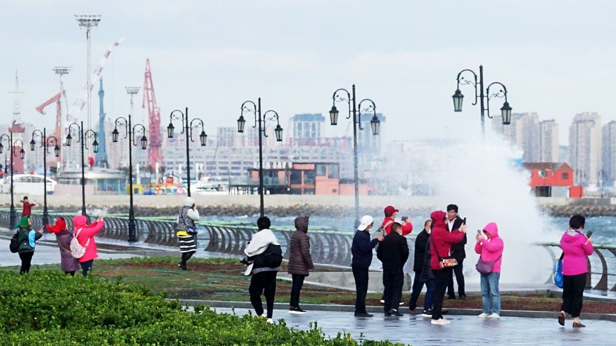 2021年10月16日,辽宁省大连市,东港商务区海面大浪翻滚,惊涛拍岸。