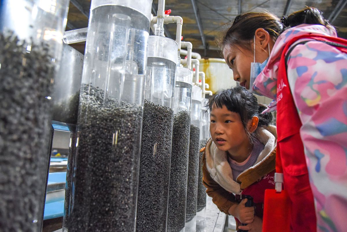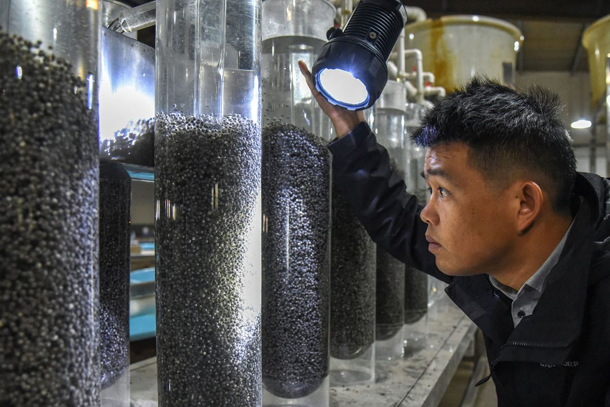 2021年10月16日,湖北荆州,技术人员在中国水产科学研究院长江水产研究所太湖试验场内观测全人工繁殖中华鲟受精卵孵化情况。