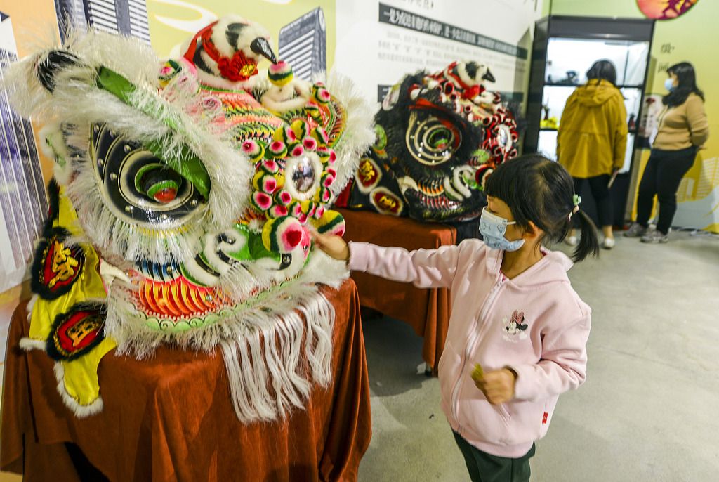 2021年10月17日,乌鲁木齐市,舞狮彩扎狮头吸引小朋友。近日,“新疆是个好地方——对口援疆19省市非物质文化遗产展”在新疆美术馆开展。 中新社记者 刘新 摄