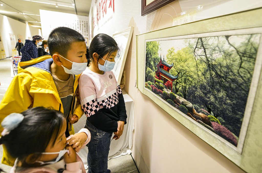 2021年10月17日,乌鲁木齐市,传统湘绣作品吸引小朋友。近日,“新疆是个好地方——对口援疆19省市非物质文化遗产展”在新疆美术馆开展。 中新社记者 刘新 摄