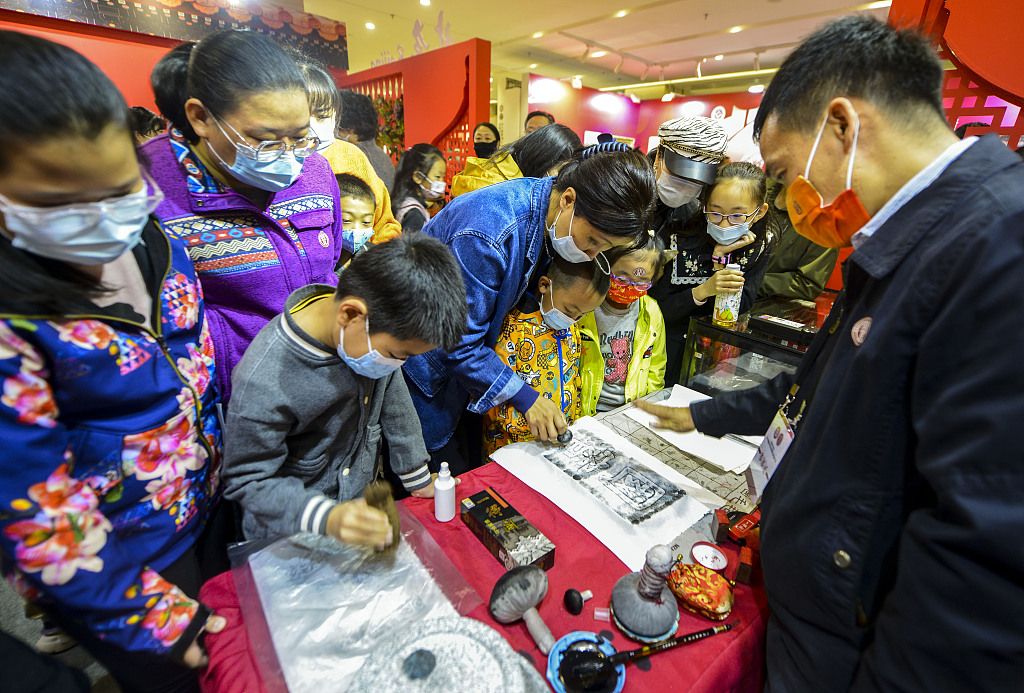 2021年10月17日,乌鲁木齐市,家长带着小朋友在一得阁制墨技艺展台体验拓印乐趣。近日,“新疆是个好地方——对口援疆19省市非物质文化遗产展”在新疆美术馆开展。 中新社记者 刘新 摄