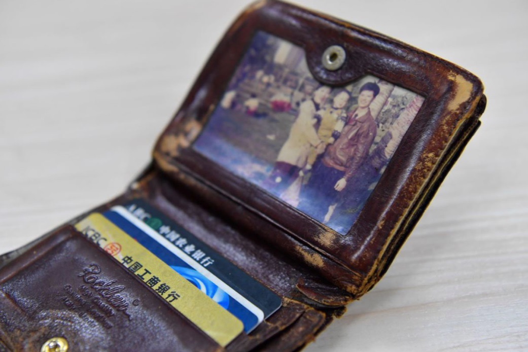 郑泳冰第一次看到潘东升的旧钱包就很吃惊,钱包表皮破损了一大块还在使用。潘东升说,这是他妻子30多年前送的,自己舍不得换,钱包里夹有一张他们一家三口的全家福照片。