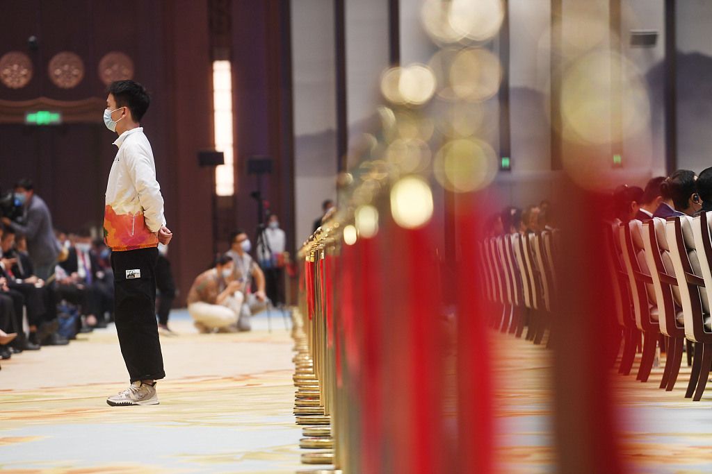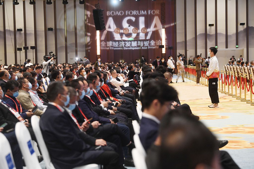 2021年10月18日,博鳌亚洲论坛“全球经济发展与安全论坛”首届大会在长沙举行,会议志愿者在认真工作。