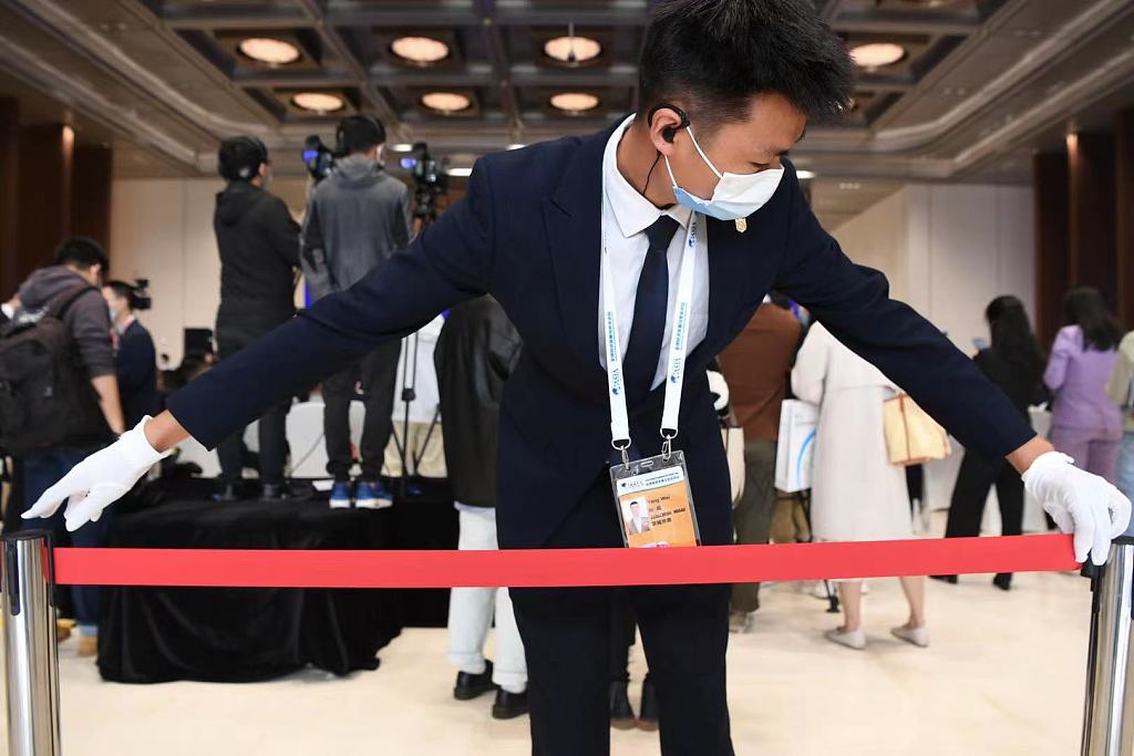 2021年10月18日,博鳌亚洲论坛“全球经济发展与安全论坛”首届大会在长沙举行,会议安保工作人员在认真工作。