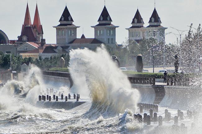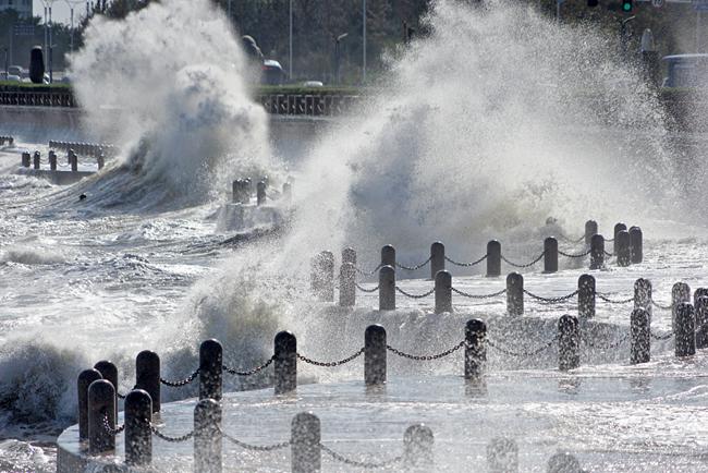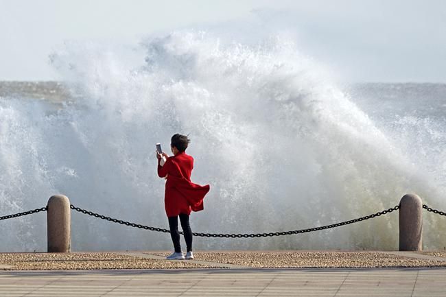 2021年10月19日,山东烟台,受较强冷空气影响,沿海出现大风天气,激起的巨浪冲击海岸,卷起数米高的浪花,蔚为壮观。