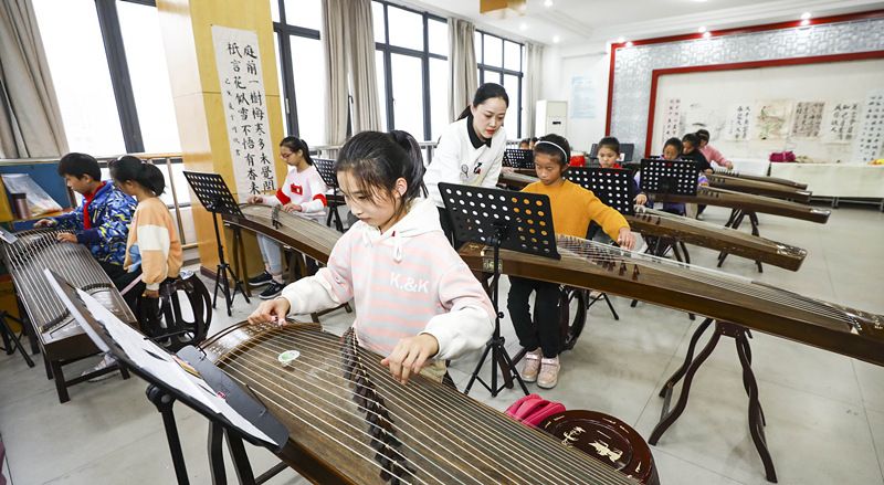 小学生练习古筝。