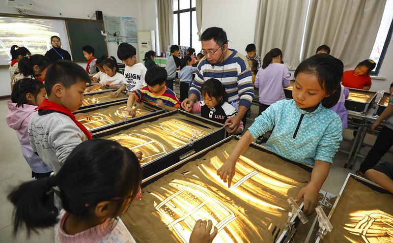 小学生学习沙画。