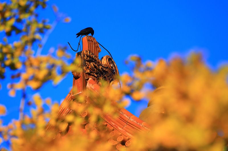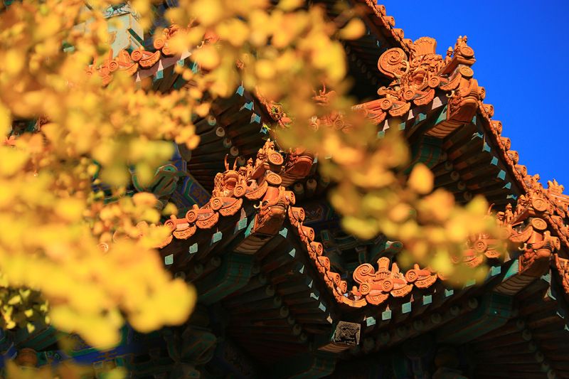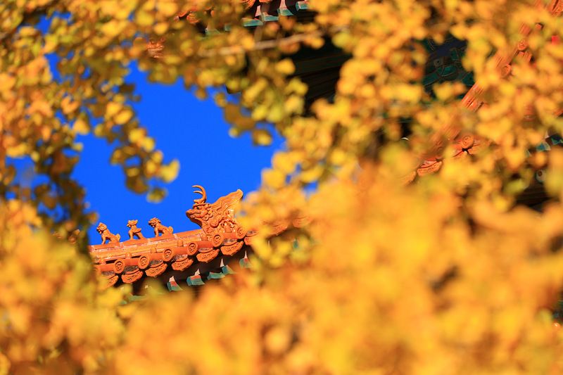 2021年10月19日,北京,故宫西南角楼旁,脊兽藏匿于一片金黄的银杏树叶之中。古建筑于银杏叶交相辉映,别有一番风味。