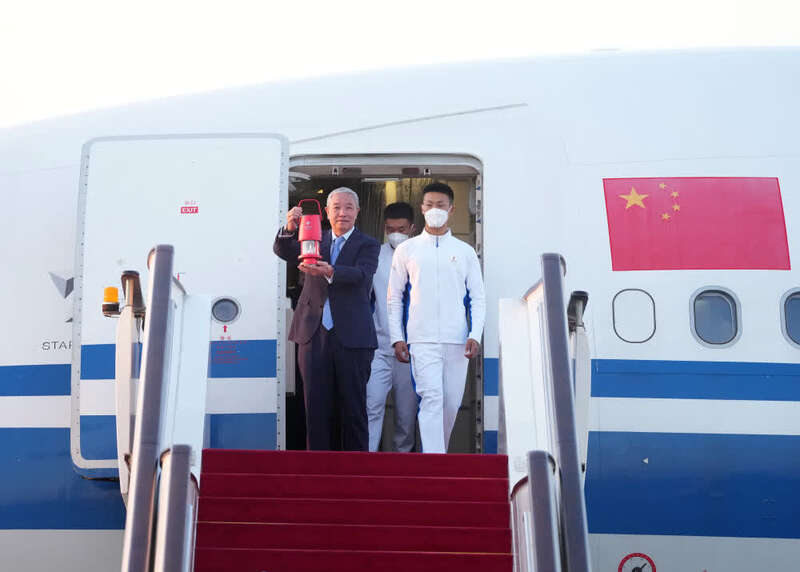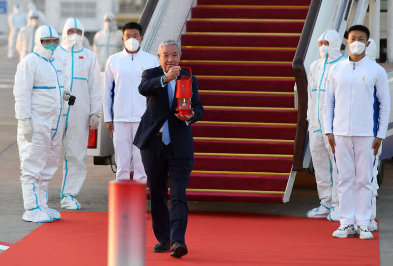 今晨抵达机场后,北京冬奥组委特别代表、北京冬奥组委副主席于再清手持火种灯走向展示台。