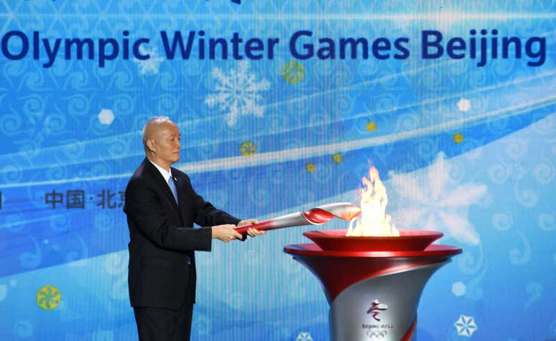 在火种欢迎仪式上,北京市委书记、北京冬奥组委主席蔡奇点燃仪式火种台。