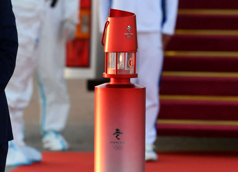 这是在机场拍摄的展示台上的北京冬奥会火种灯。