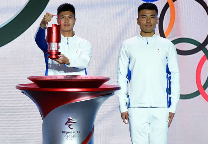 护卫人员在火种欢迎仪式现场展示北京冬奥会火种灯。