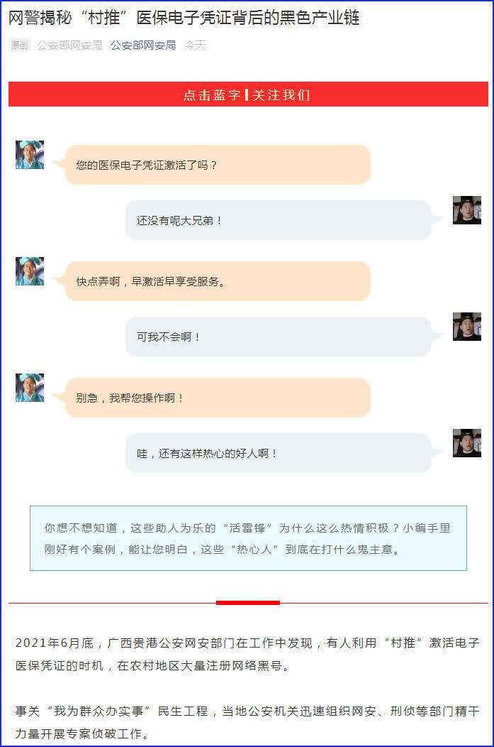 据“公安部网安局”微信公众号消息,近日,公安部门破获一起利用“免费激活医保电子凭证”非法获取村民的个人信息,进而恶意注册各类网络账号并贩卖牟利的团伙。