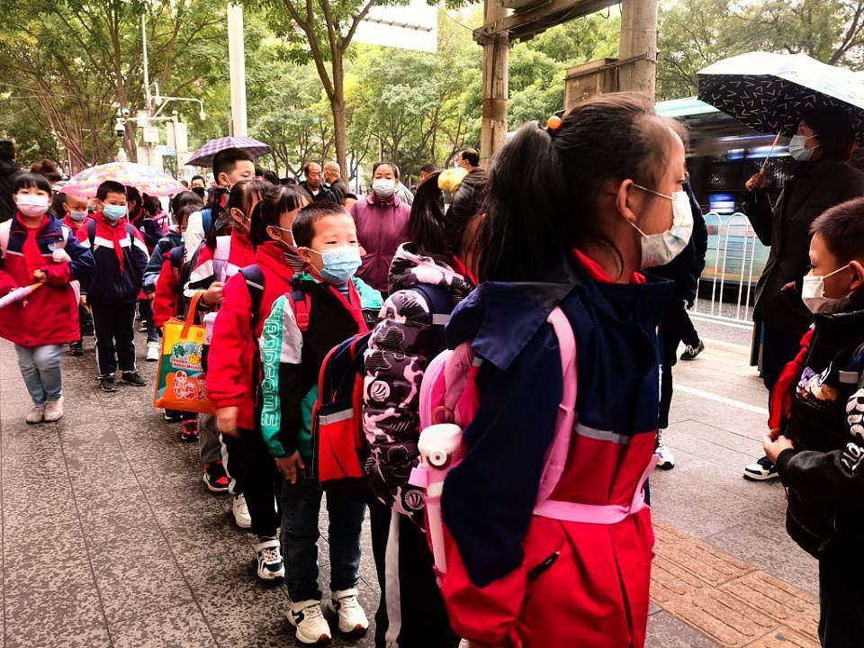 2021年10月19日,兰州城关区酒泉路小学,学生戴口罩有序排队。