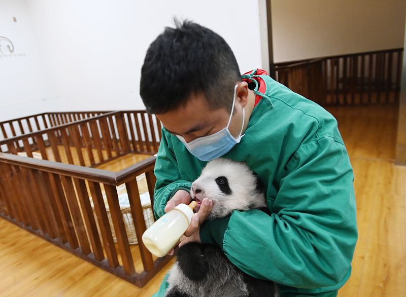 2021年10月20日,四川卧龙,中国大熊猫保护研究中心神树坪基地育幼室内,2021年新生的大熊猫宝宝萌态十足,饲养师给2021年新生的大熊猫宝宝喂奶。