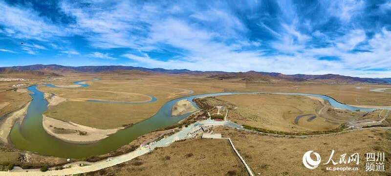 晶莹剔透的白河,在深秋的红原划过一道优美的弧线,仿佛一弯落在人间的新月,天蓝云白、水碧地灿。这里,是国家4A级旅游景区、被《中国国家地理》评为“100个最美观景拍摄点”之一的月亮湾。